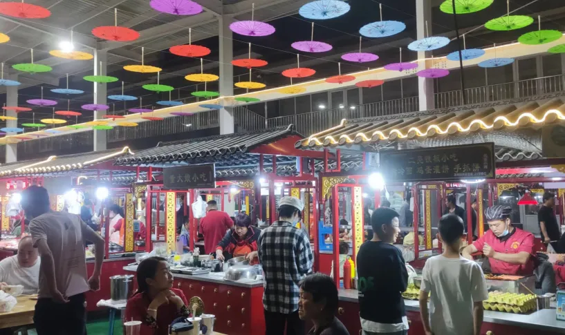 大紅燈籠高高掛,預示永壽縣人民生活紅紅火火。美食檔口設計復古,錯落有致,油紙傘在空中飄揚,別有一番生活韻味。